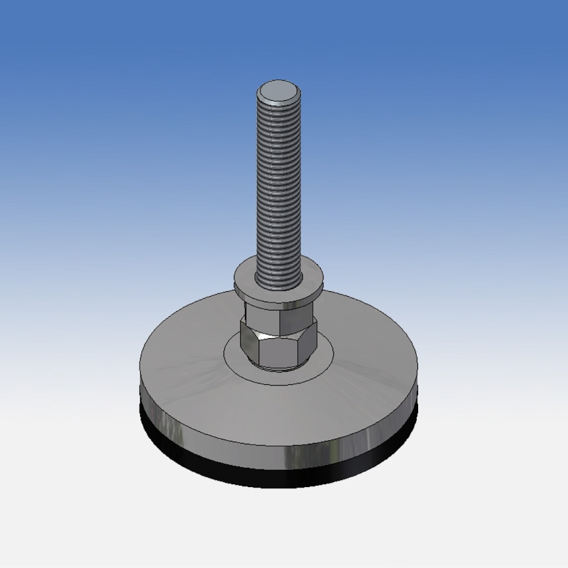 Piedino snodato antiscivolo utilizzabile con o senza piastra porta piedino M12. Dimensioni: M12, diametro base: 75mm, altezza stelo: 75mm, altezza totale: 105mm