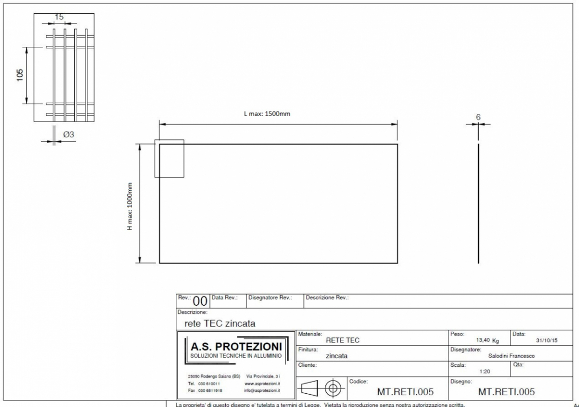 DESCRIZIONE: Rete in ferro zincato. Diametro filo: 3mm. Maglia: 15x105mm. Altezza massima: 1200mm.